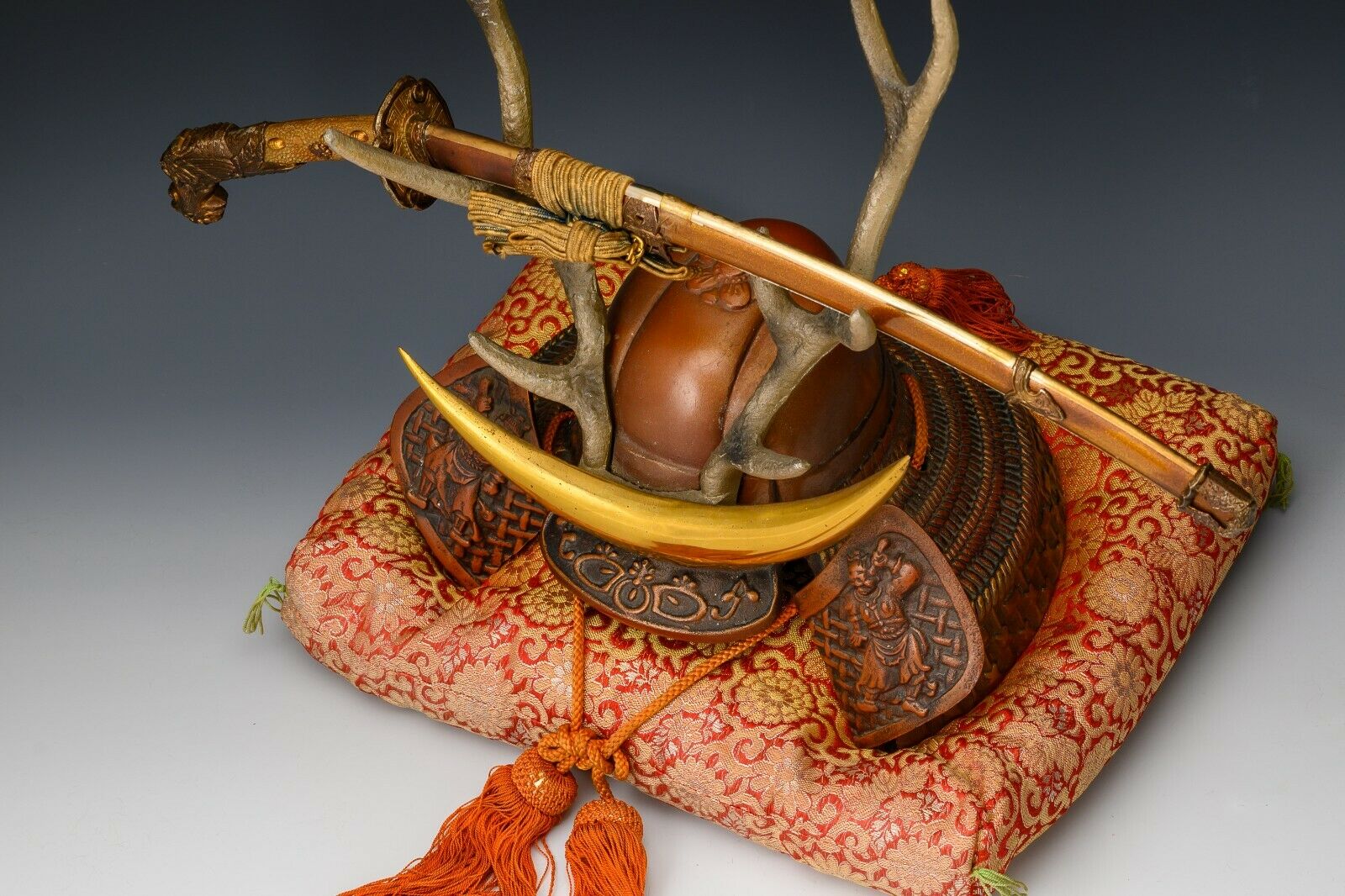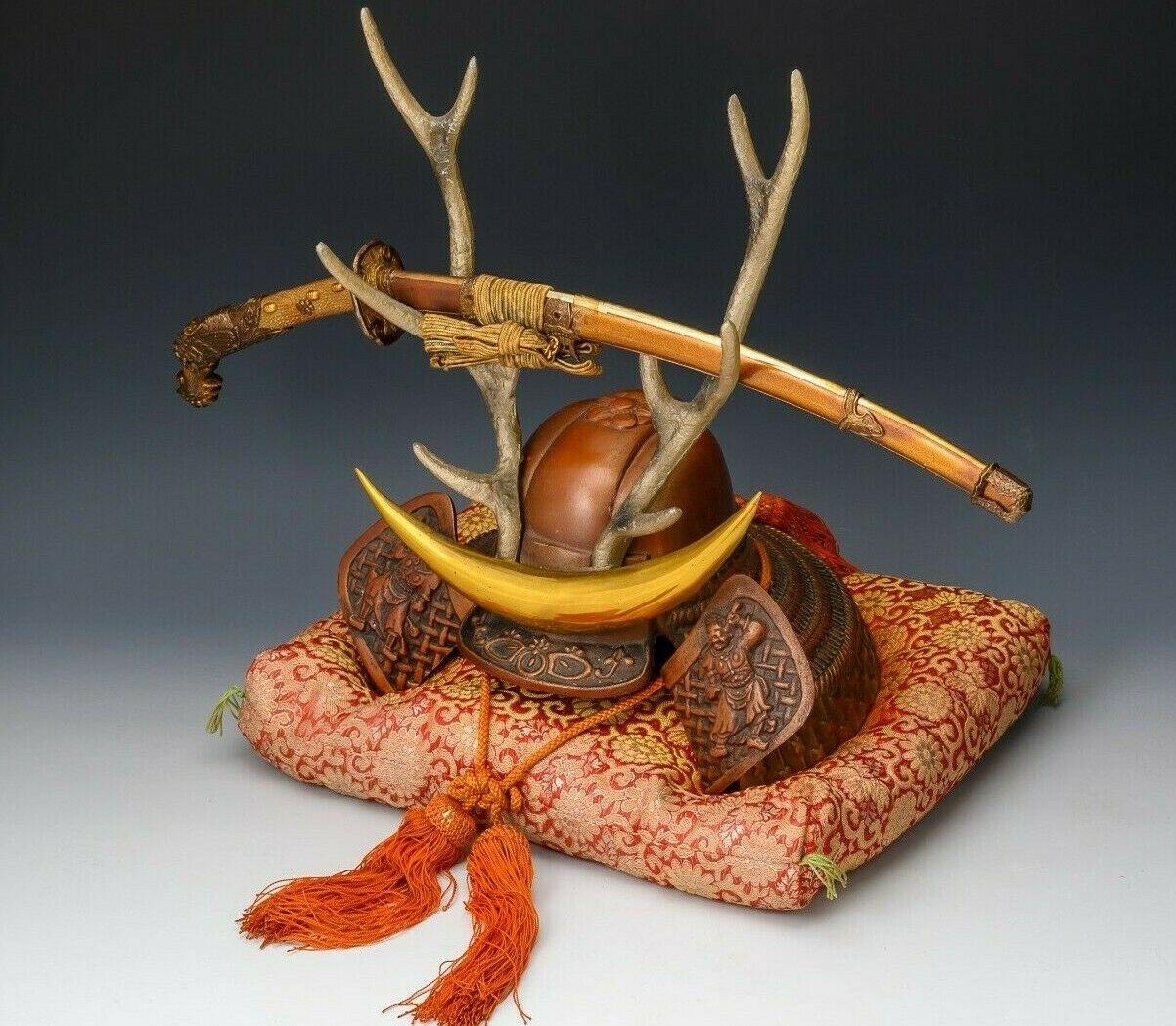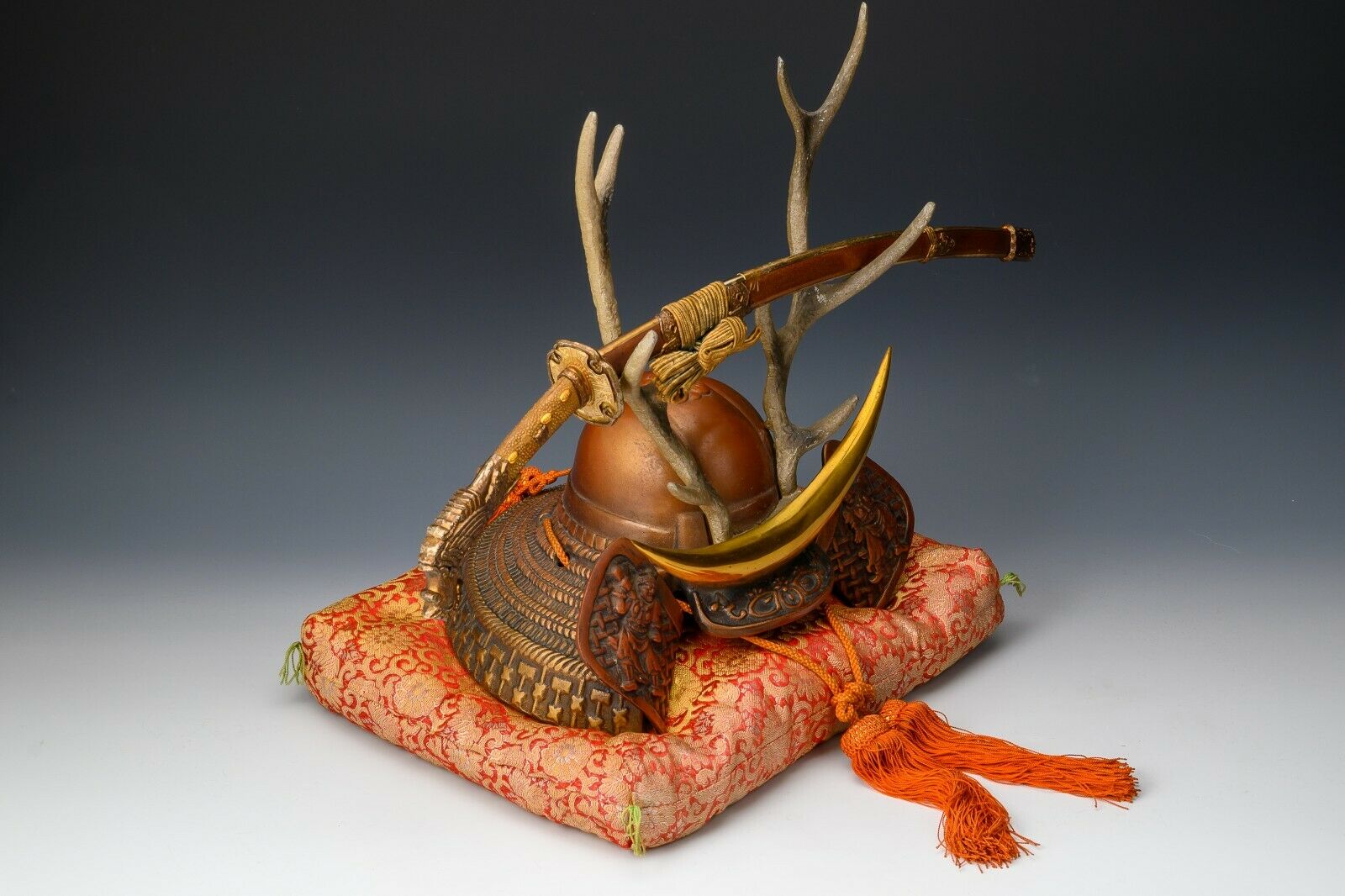 The Kabuto helmet is decorated with antlers/horns (Kuwagata) and a front crest (Maedate) such as an arranged sword,