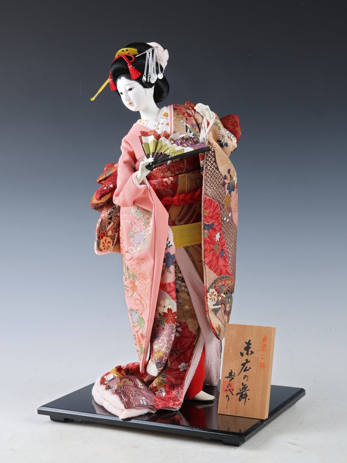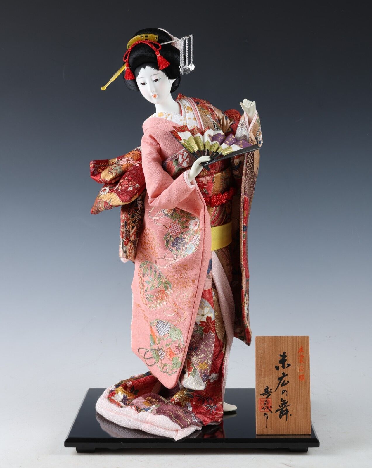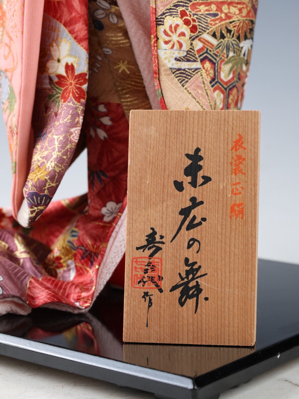“A wooden plate” beside the doll shows you the title of the work with the craftsman’s signature carries on the Japanese tradition.