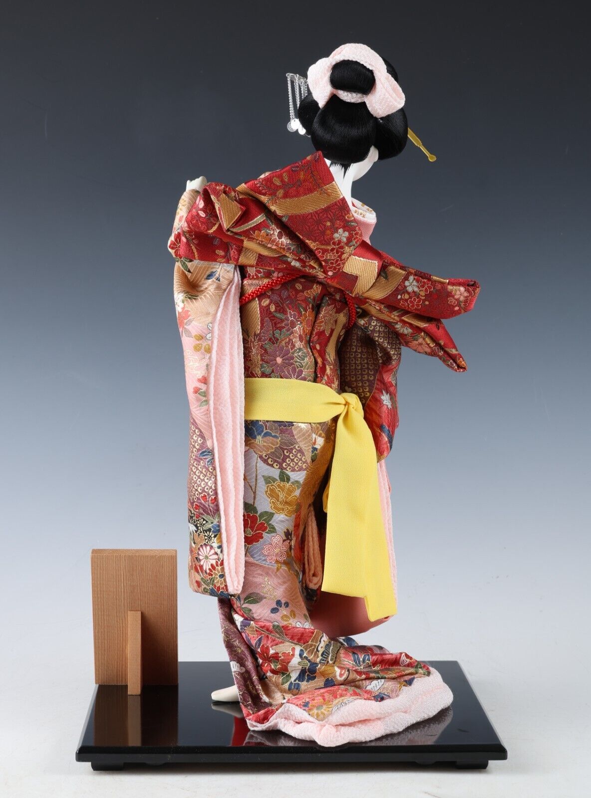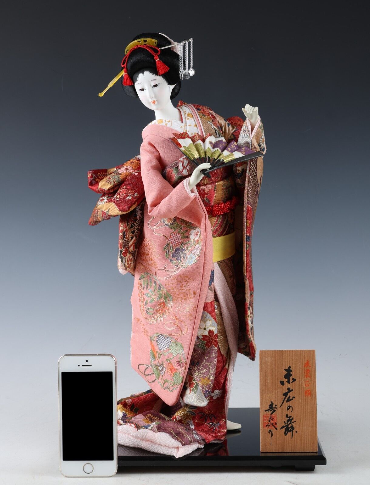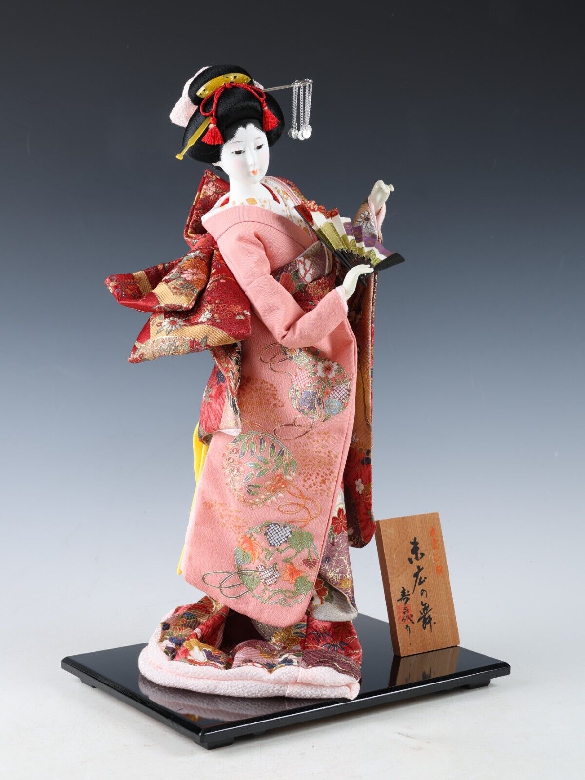 “A wooden plate” beside the doll shows you the title of the work with the craftsman’s signature carries on the Japanese tradition.